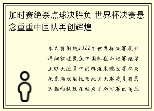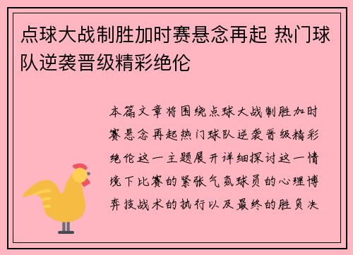 本篇文章将围绕“点球大战制胜加时赛悬念再...