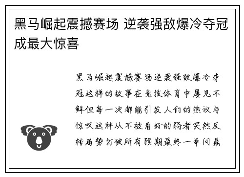 黑马崛起震撼赛场,逆袭强敌爆冷夺冠,这样...