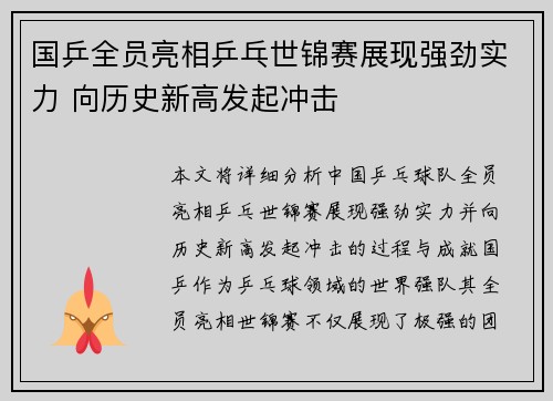 本文将详细分析中国乒乓球队全员亮相乒乓世...