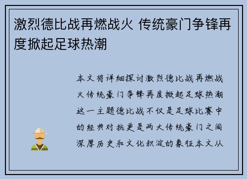 本文将详细探讨“激烈德比战再燃战火,传统...
