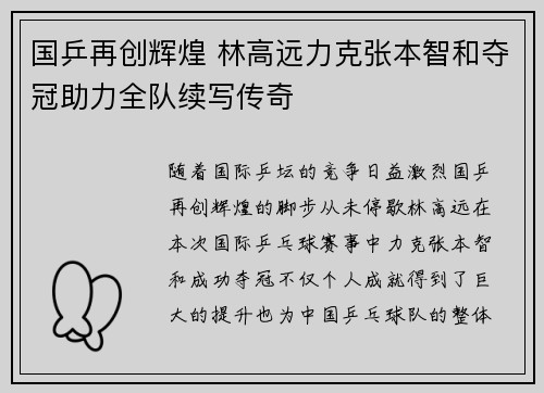 随着国际乒坛的竞争日益激烈,国乒再创辉煌...
