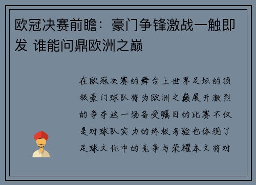 在欧冠决赛的舞台上,世界足坛的顶级豪门球...