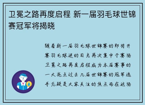 随着新一届羽毛球世锦赛的即将开赛,羽毛球...