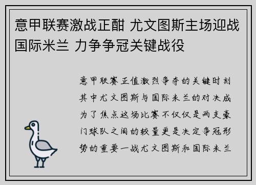 意甲联赛正值激烈争夺的关键时刻,其中尤文...