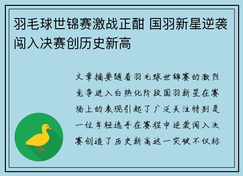 文章摘要:随着羽毛球世锦赛的激烈竞争进入...