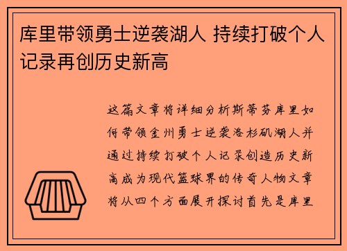 这篇文章将详细分析斯蒂芬·库里如何带领金...