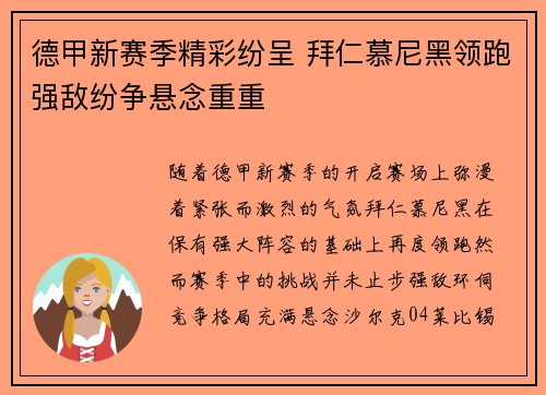 随着德甲新赛季的开启,赛场上弥漫着紧张而...