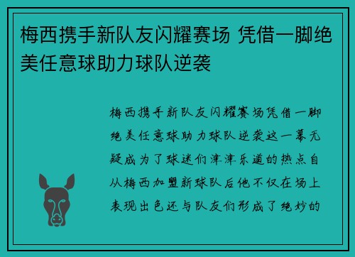 梅西携手新队友闪耀赛场,凭借一脚绝美任意...