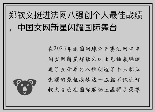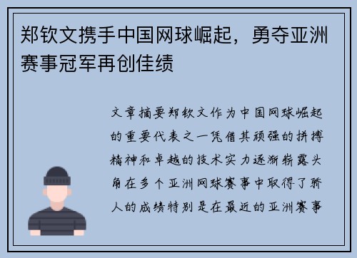 文章摘要:郑钦文,作为中国网球崛起的重要...