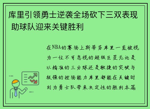 在NBA的赛场上,斯蒂芬·库里一直被视为...