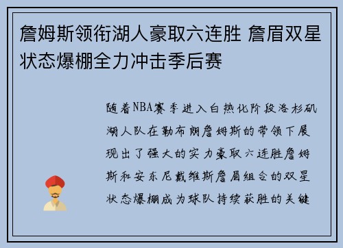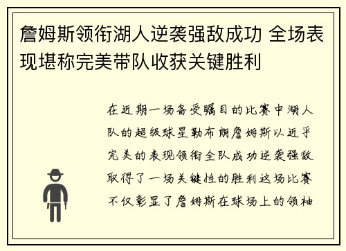 文章摘要的内容:本文深入分析了詹姆斯领衔...